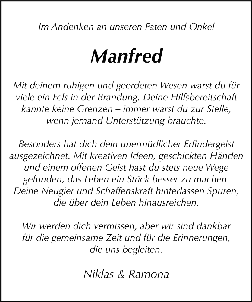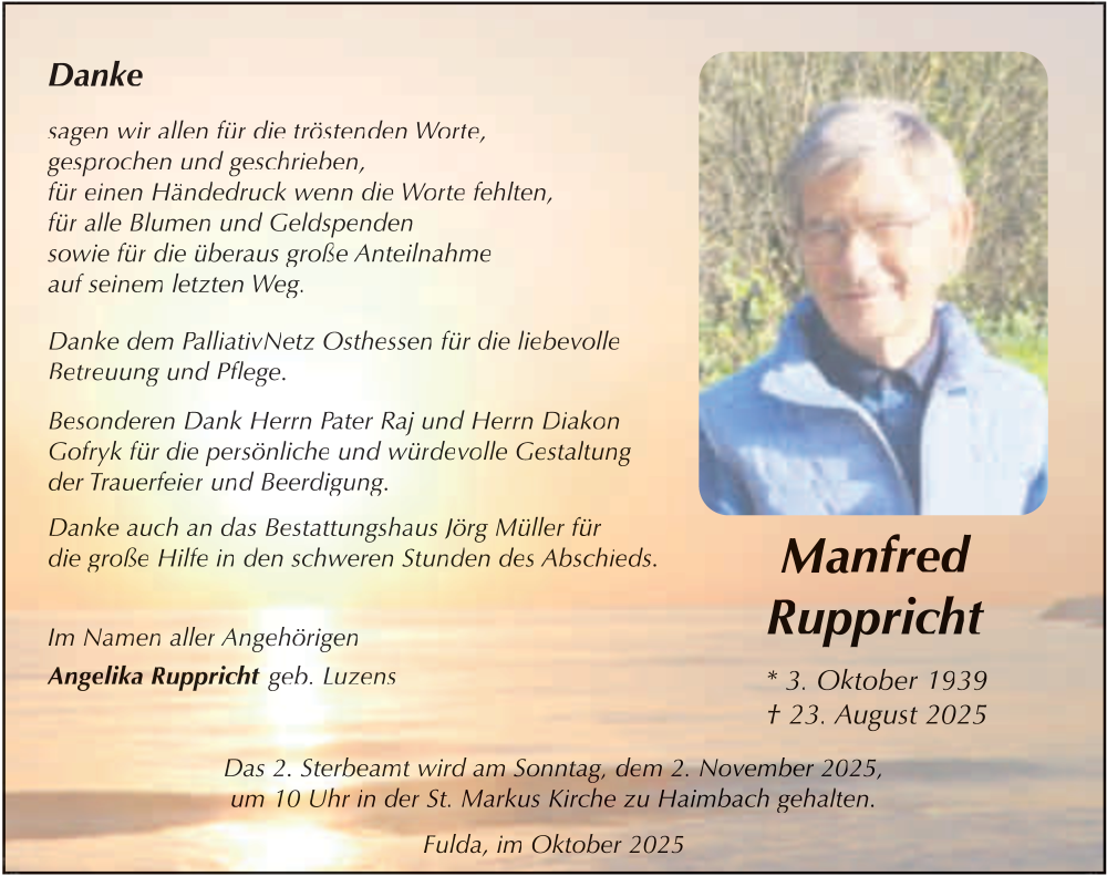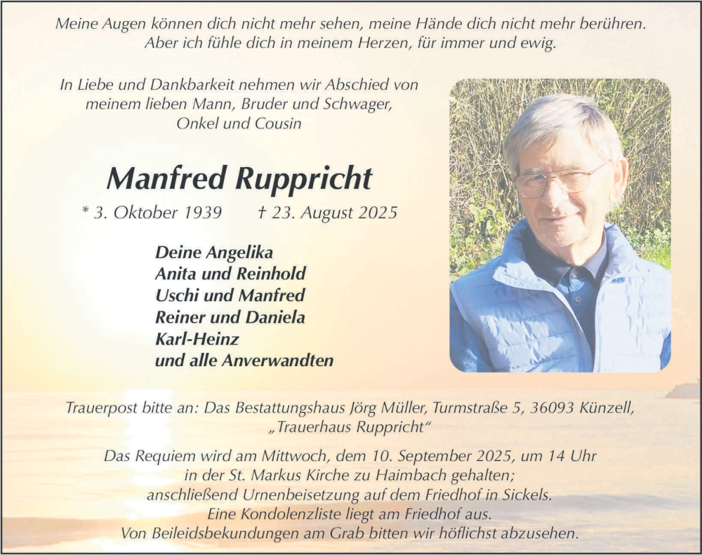 Hier finden Sie alle Traueranzeigen aus der Zeitung, die bisher für Manfred Ruppricht erschienen sind. Weitere Traueranzeigen, die in der Zeitung erscheinen, werden hier ebenfalls aufgelistet