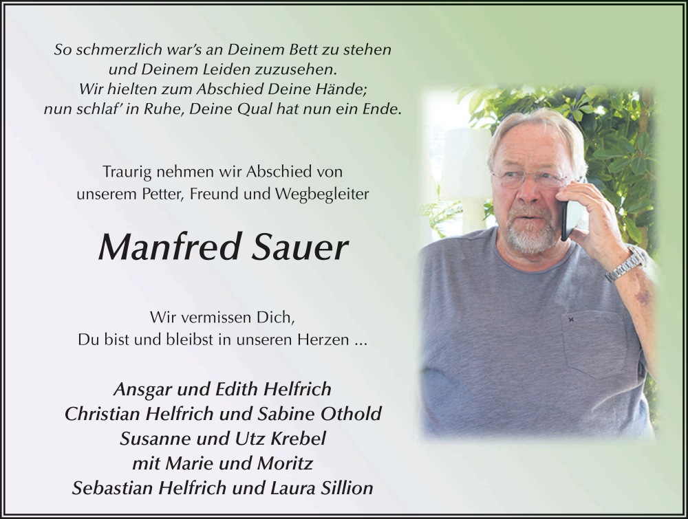 Hier finden Sie alle Traueranzeigen aus der Zeitung, die bisher für Manfred Sauer erschienen sind. Weitere Traueranzeigen, die in der Zeitung erscheinen, werden hier ebenfalls aufgelistet