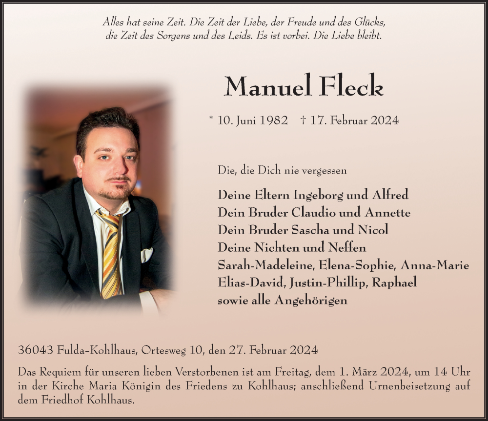 Hier finden Sie alle Traueranzeigen aus der Zeitung, die bisher für Manuel Fleck erschienen sind. Weitere Traueranzeigen, die in der Zeitung erscheinen, werden hier ebenfalls aufgelistet