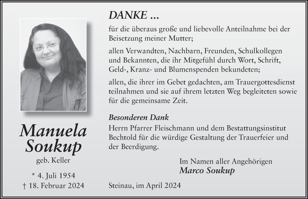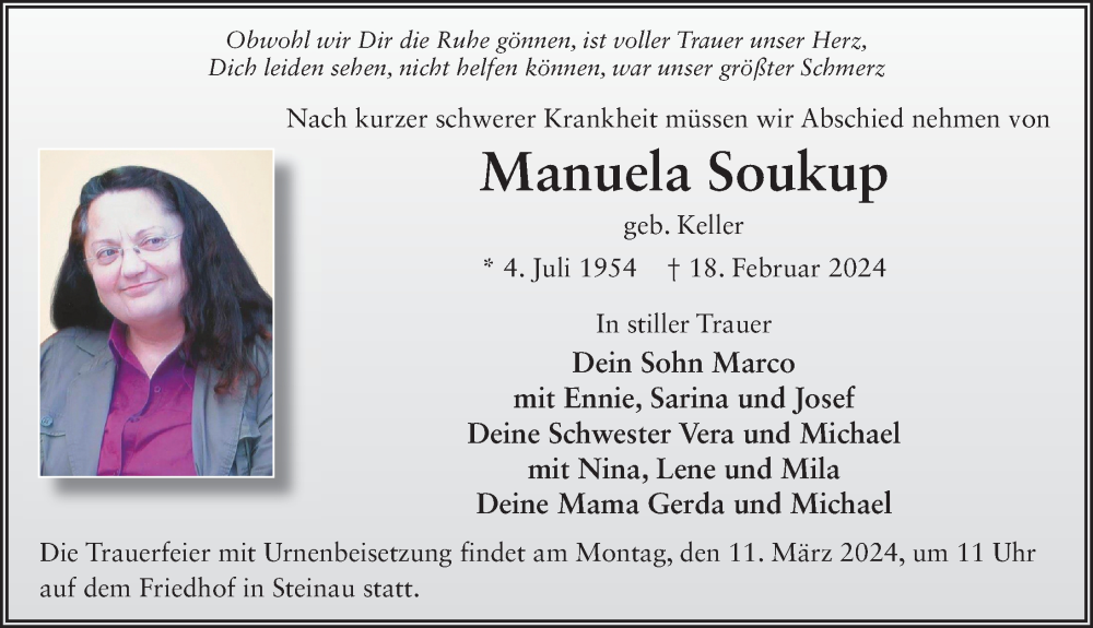 Hier finden Sie alle Traueranzeigen aus der Zeitung, die bisher für Manuela Soukup erschienen sind. Weitere Traueranzeigen, die in der Zeitung erscheinen, werden hier ebenfalls aufgelistet