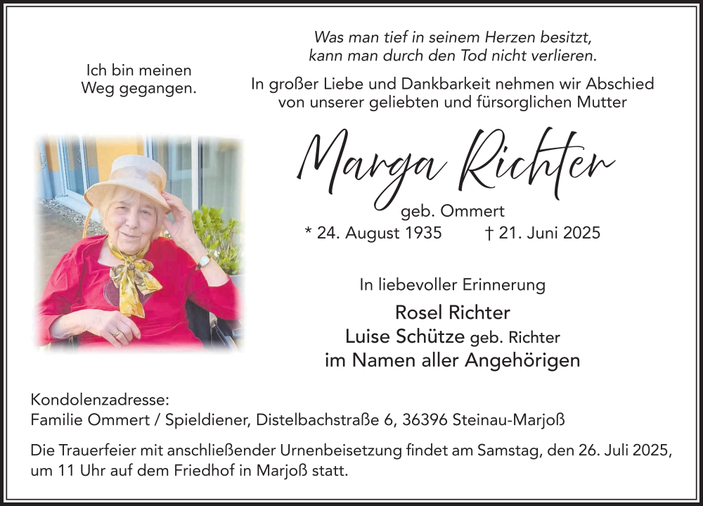 Hier finden Sie alle Traueranzeigen aus der Zeitung, die bisher für Marga Richter erschienen sind. Weitere Traueranzeigen, die in der Zeitung erscheinen, werden hier ebenfalls aufgelistet