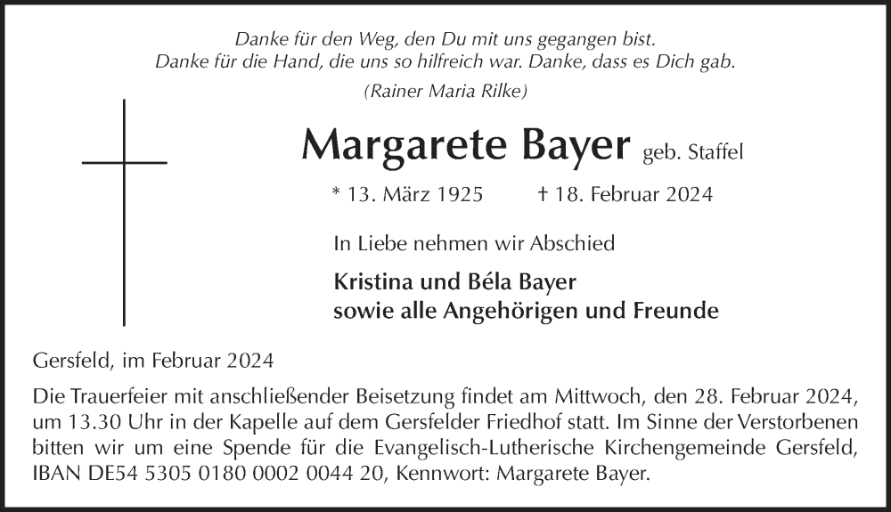 Hier finden Sie alle Traueranzeigen aus der Zeitung, die bisher für Margarete Bayer erschienen sind. Weitere Traueranzeigen, die in der Zeitung erscheinen, werden hier ebenfalls aufgelistet
