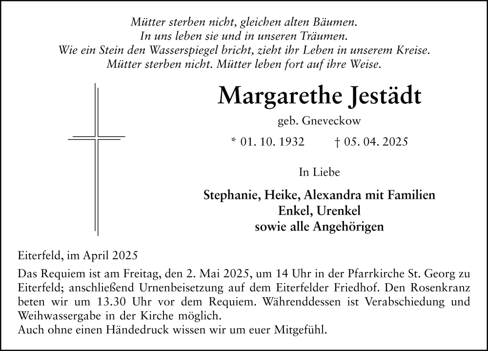 Hier finden Sie alle Traueranzeigen aus der Zeitung, die bisher für Margarethe Jestädt erschienen sind. Weitere Traueranzeigen, die in der Zeitung erscheinen, werden hier ebenfalls aufgelistet