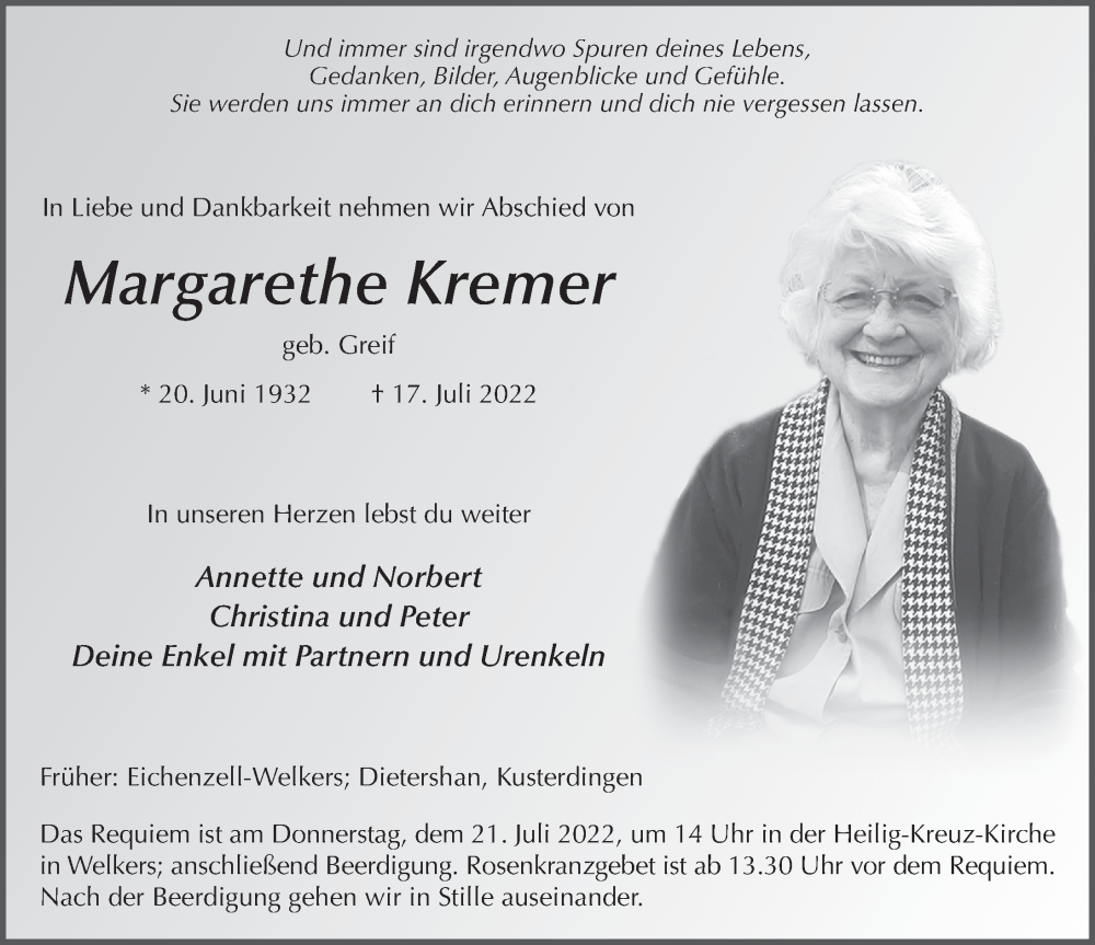 Hier finden Sie alle Traueranzeigen aus der Zeitung, die bisher für Margarethe Kremer erschienen sind. Weitere Traueranzeigen, die in der Zeitung erscheinen, werden hier ebenfalls aufgelistet
