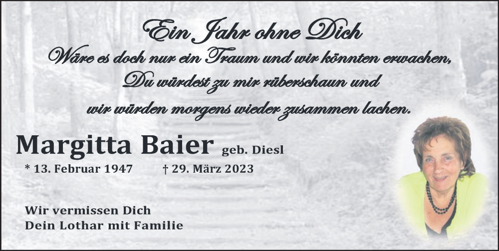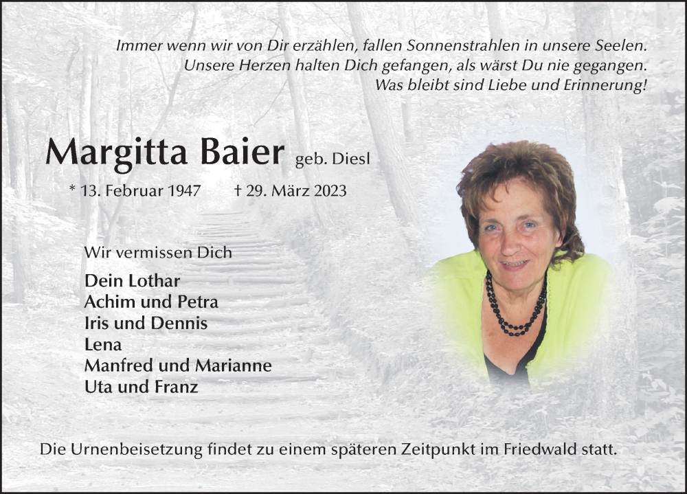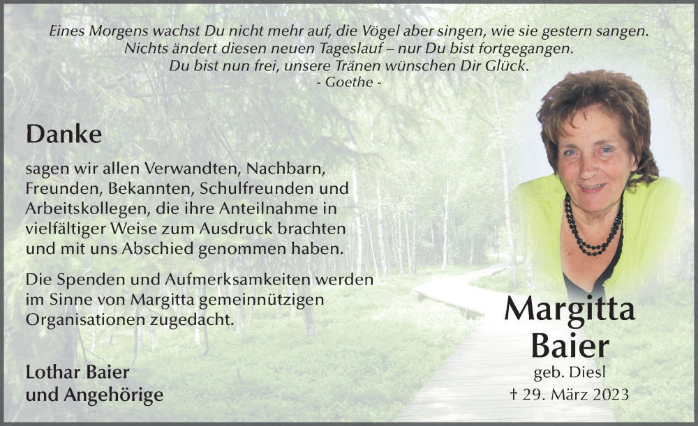 Hier finden Sie alle Traueranzeigen aus der Zeitung, die bisher für Margitta Baier erschienen sind. Weitere Traueranzeigen, die in der Zeitung erscheinen, werden hier ebenfalls aufgelistet
