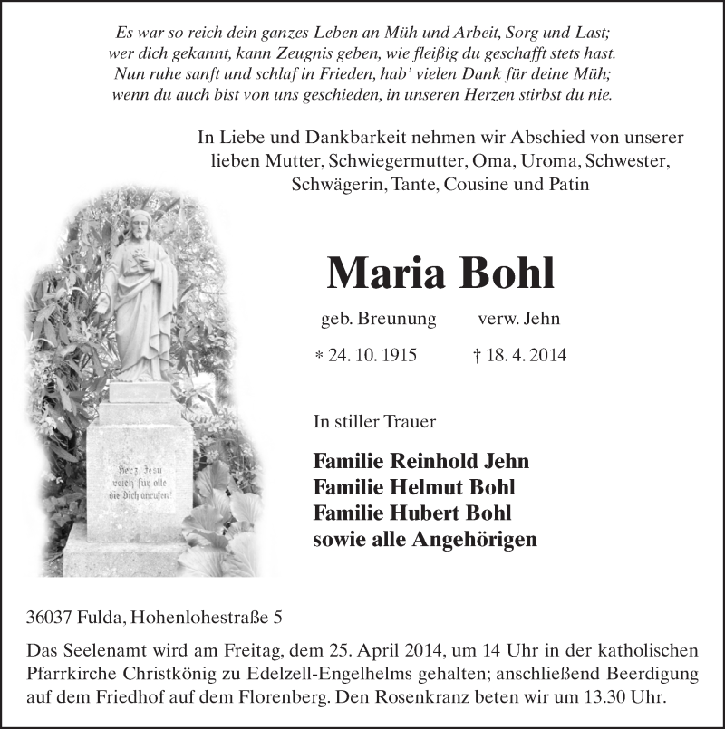 Hier finden Sie alle Traueranzeigen aus der Zeitung, die bisher für Maria Bohl erschienen sind. Weitere Traueranzeigen, die in der Zeitung erscheinen, werden hier ebenfalls aufgelistet