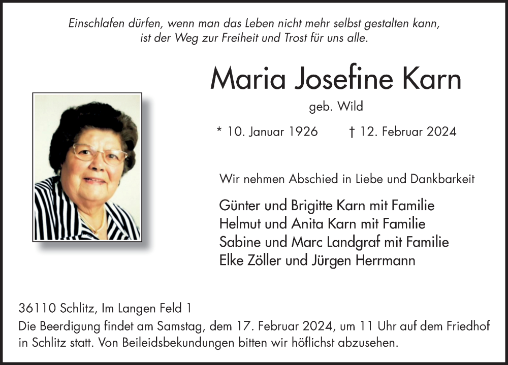 Hier finden Sie alle Traueranzeigen aus der Zeitung, die bisher für Maria Josefine Karn erschienen sind. Weitere Traueranzeigen, die in der Zeitung erscheinen, werden hier ebenfalls aufgelistet