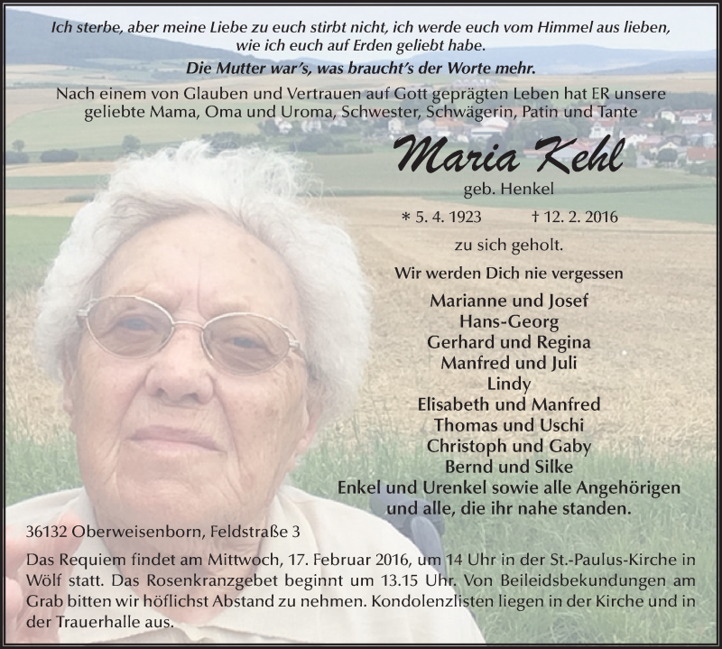 Hier finden Sie alle Traueranzeigen aus der Zeitung, die bisher für Maria Kehl erschienen sind. Weitere Traueranzeigen, die in der Zeitung erscheinen, werden hier ebenfalls aufgelistet