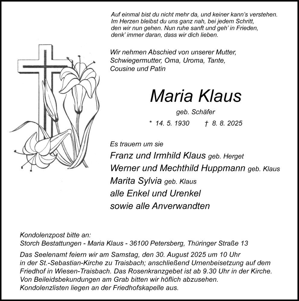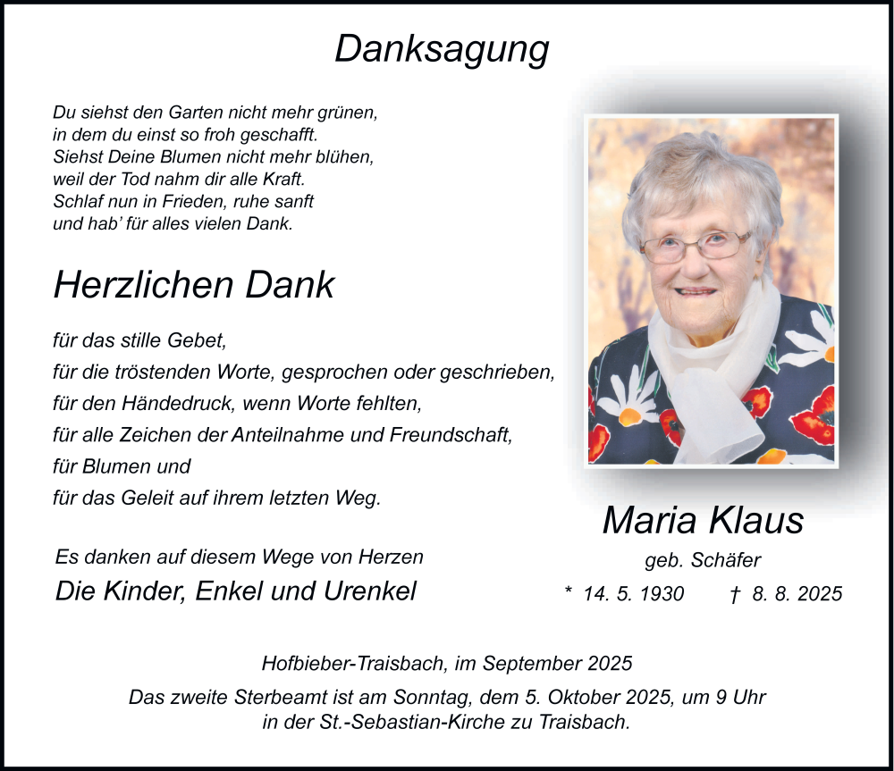 Hier finden Sie alle Traueranzeigen aus der Zeitung, die bisher für Maria Klaus erschienen sind. Weitere Traueranzeigen, die in der Zeitung erscheinen, werden hier ebenfalls aufgelistet