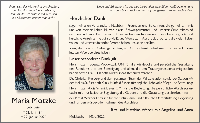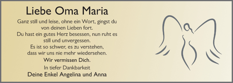 Hier finden Sie alle Traueranzeigen aus der Zeitung, die bisher für Maria Motzke erschienen sind. Weitere Traueranzeigen, die in der Zeitung erscheinen, werden hier ebenfalls aufgelistet