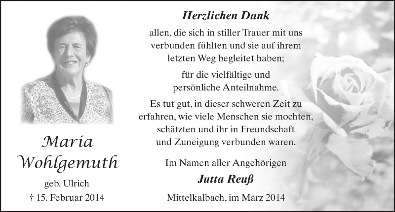 Hier finden Sie alle Traueranzeigen aus der Zeitung, die bisher für Maria Wohlgemuth erschienen sind. Weitere Traueranzeigen, die in der Zeitung erscheinen, werden hier ebenfalls aufgelistet