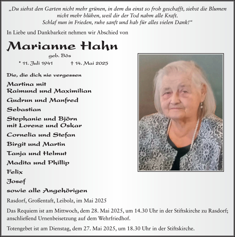 Hier finden Sie alle Traueranzeigen aus der Zeitung, die bisher für Marianne Hahn erschienen sind. Weitere Traueranzeigen, die in der Zeitung erscheinen, werden hier ebenfalls aufgelistet