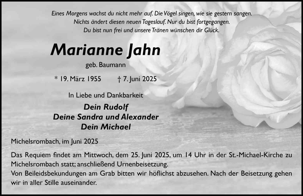 Hier finden Sie alle Traueranzeigen aus der Zeitung, die bisher für Marianne Jahn erschienen sind. Weitere Traueranzeigen, die in der Zeitung erscheinen, werden hier ebenfalls aufgelistet