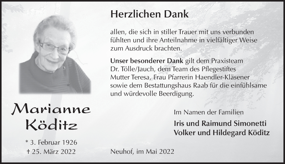 Hier finden Sie alle Traueranzeigen aus der Zeitung, die bisher für Marianne Köditz erschienen sind. Weitere Traueranzeigen, die in der Zeitung erscheinen, werden hier ebenfalls aufgelistet