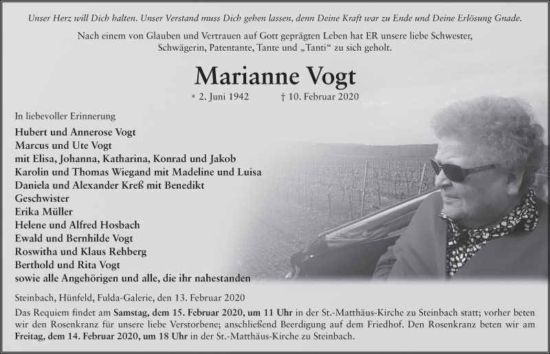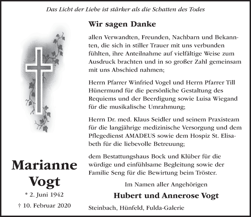 Hier finden Sie alle Traueranzeigen aus der Zeitung, die bisher für Marianne Vogt erschienen sind. Weitere Traueranzeigen, die in der Zeitung erscheinen, werden hier ebenfalls aufgelistet