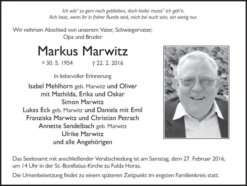Hier finden Sie alle Traueranzeigen aus der Zeitung, die bisher für Markus Marwitz erschienen sind. Weitere Traueranzeigen, die in der Zeitung erscheinen, werden hier ebenfalls aufgelistet