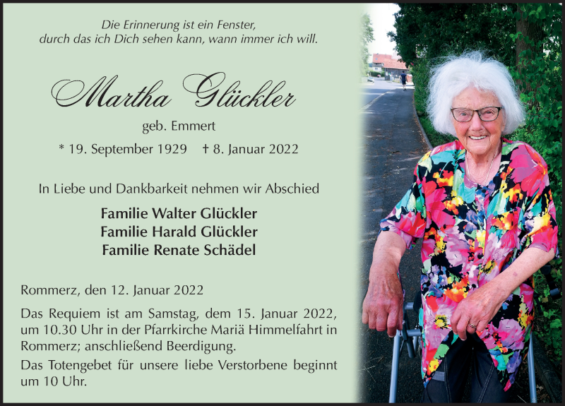Hier finden Sie alle Traueranzeigen aus der Zeitung, die bisher für Martha Glückler erschienen sind. Weitere Traueranzeigen, die in der Zeitung erscheinen, werden hier ebenfalls aufgelistet