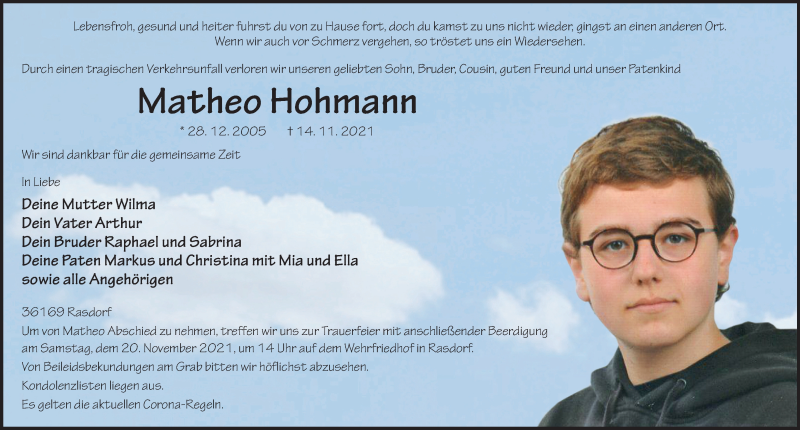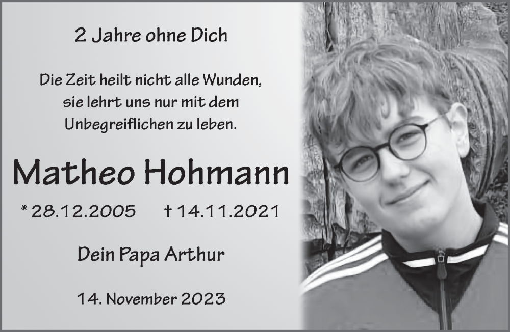 Hier finden Sie alle Traueranzeigen aus der Zeitung, die bisher für Matheo Hohmann erschienen sind. Weitere Traueranzeigen, die in der Zeitung erscheinen, werden hier ebenfalls aufgelistet