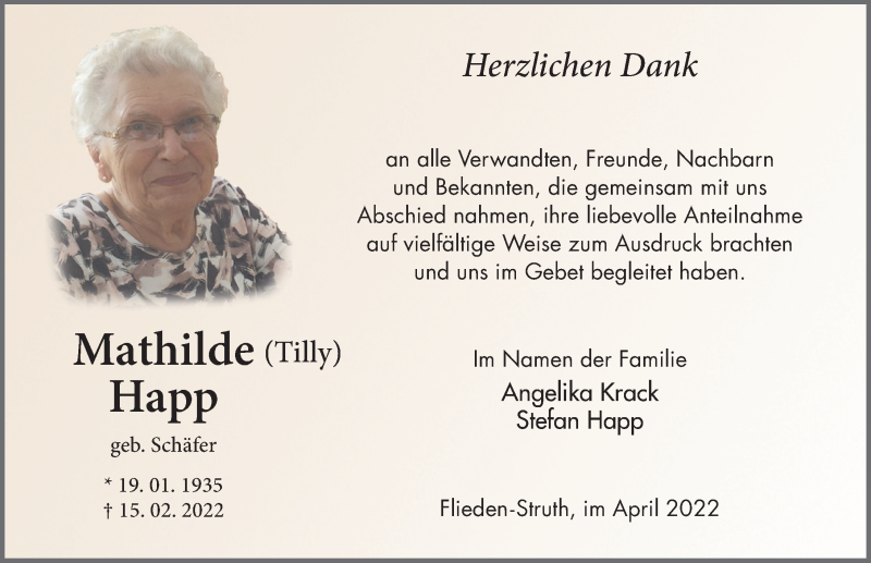 Hier finden Sie alle Traueranzeigen aus der Zeitung, die bisher für Mathilde Happ erschienen sind. Weitere Traueranzeigen, die in der Zeitung erscheinen, werden hier ebenfalls aufgelistet
