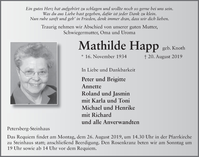 Hier finden Sie alle Traueranzeigen aus der Zeitung, die bisher für Mathilde Happ erschienen sind. Weitere Traueranzeigen, die in der Zeitung erscheinen, werden hier ebenfalls aufgelistet