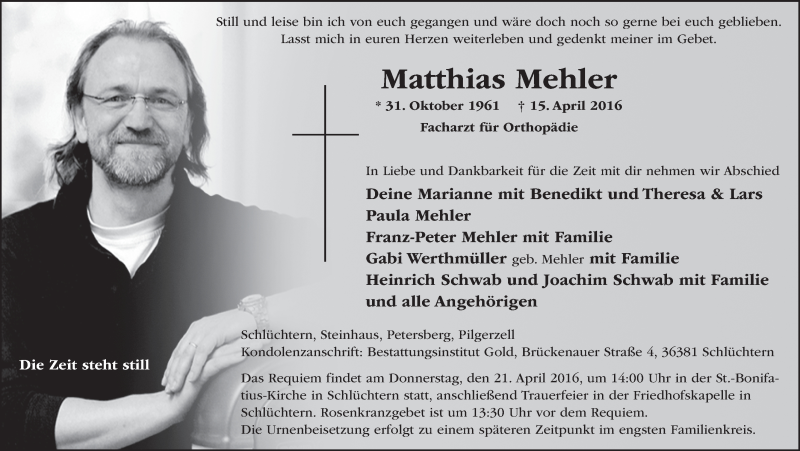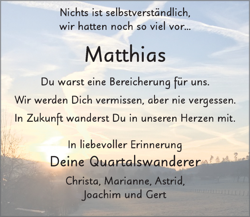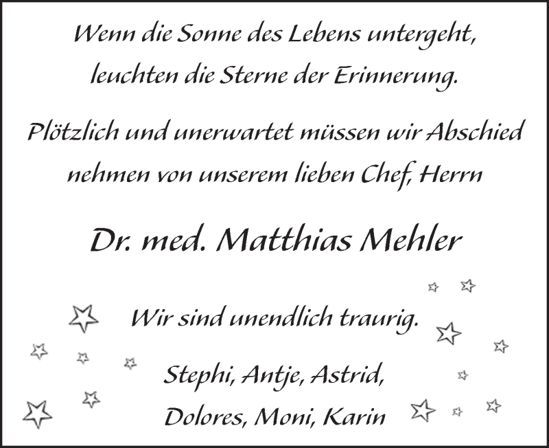 Hier finden Sie alle Traueranzeigen aus der Zeitung, die bisher für Matthias Mehler erschienen sind. Weitere Traueranzeigen, die in der Zeitung erscheinen, werden hier ebenfalls aufgelistet