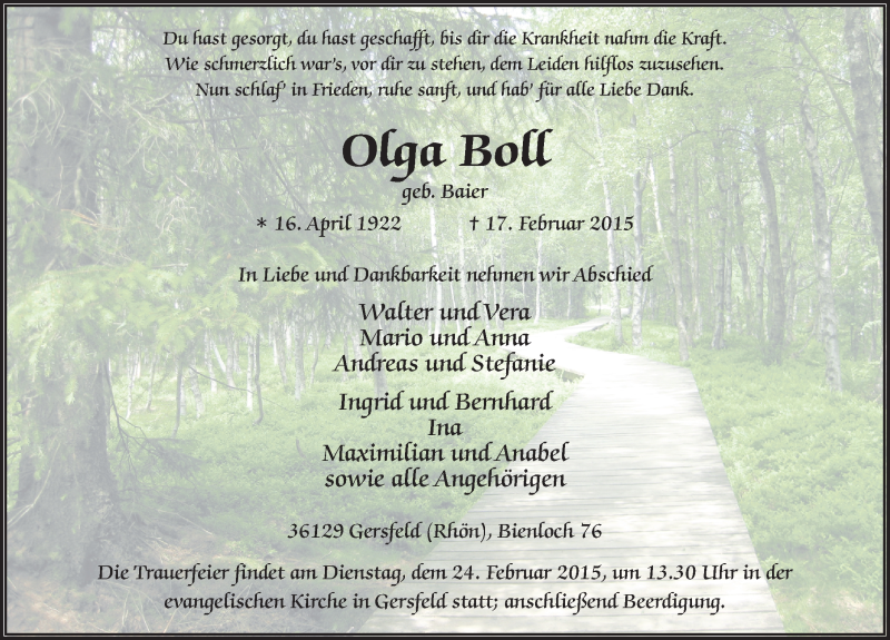 Hier finden Sie alle Traueranzeigen aus der Zeitung, die bisher für Olga Boll erschienen sind. Weitere Traueranzeigen, die in der Zeitung erscheinen, werden hier ebenfalls aufgelistet