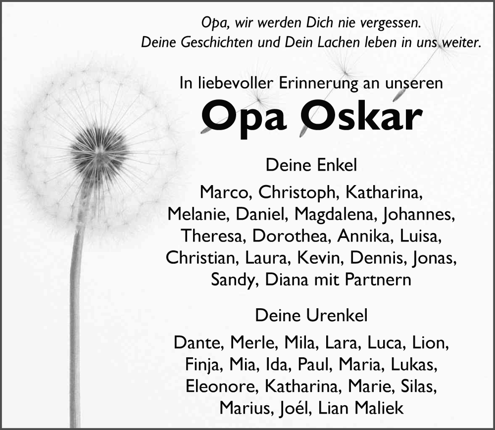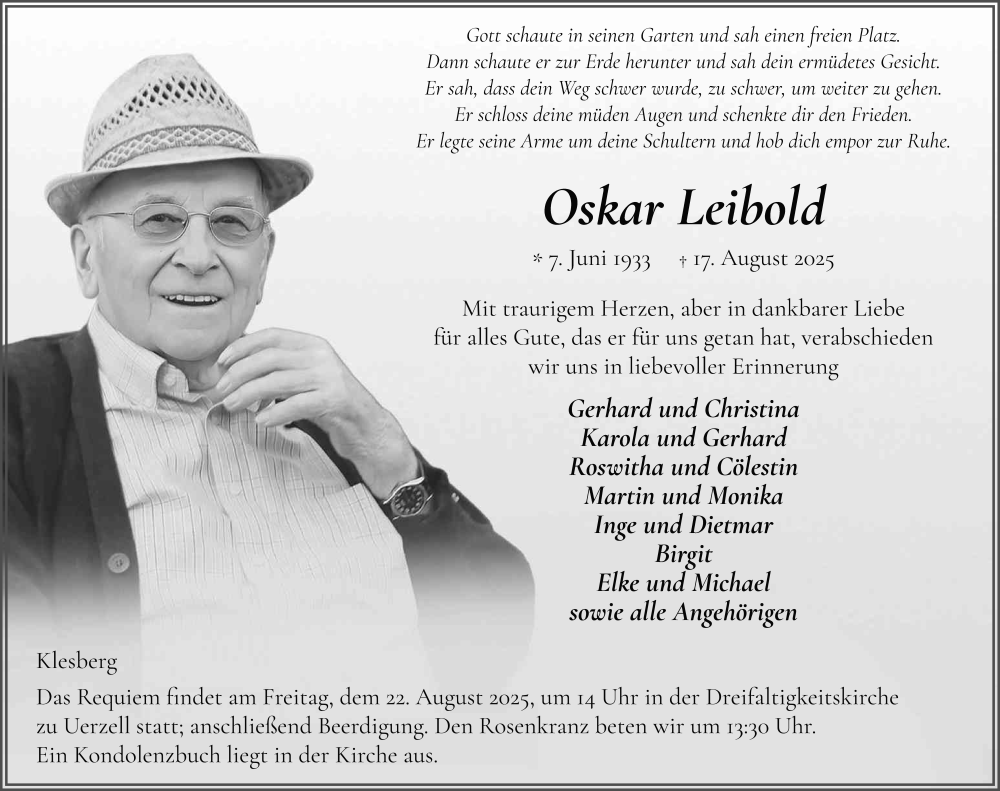 Hier finden Sie alle Traueranzeigen aus der Zeitung, die bisher für Oskar Leibold erschienen sind. Weitere Traueranzeigen, die in der Zeitung erscheinen, werden hier ebenfalls aufgelistet