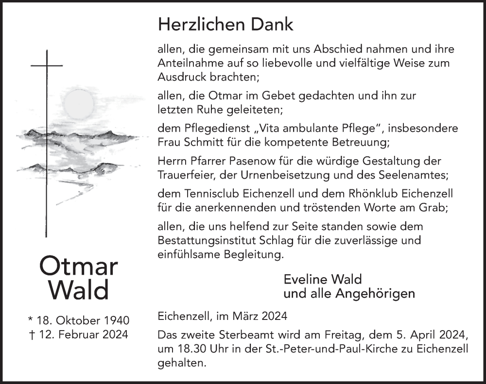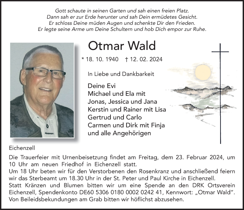 Hier finden Sie alle Traueranzeigen aus der Zeitung, die bisher für Otmar Wald erschienen sind. Weitere Traueranzeigen, die in der Zeitung erscheinen, werden hier ebenfalls aufgelistet