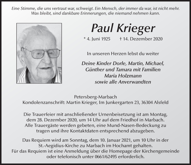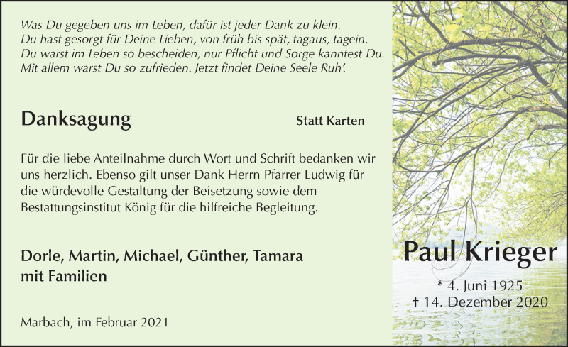 Hier finden Sie alle Traueranzeigen aus der Zeitung, die bisher für Paul Krieger erschienen sind. Weitere Traueranzeigen, die in der Zeitung erscheinen, werden hier ebenfalls aufgelistet