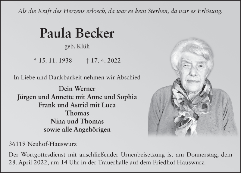 Hier finden Sie alle Traueranzeigen aus der Zeitung, die bisher für Paula Becker erschienen sind. Weitere Traueranzeigen, die in der Zeitung erscheinen, werden hier ebenfalls aufgelistet