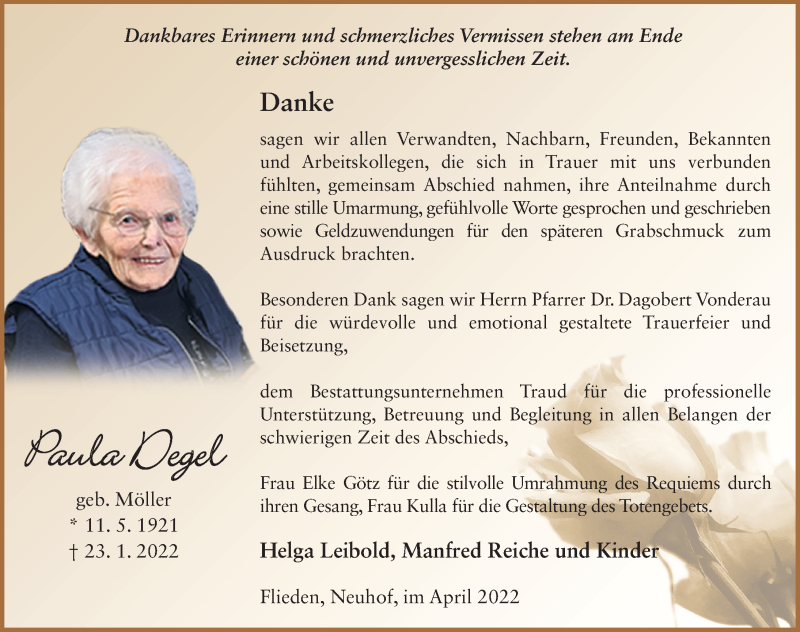 Hier finden Sie alle Traueranzeigen aus der Zeitung, die bisher für Paula Degel erschienen sind. Weitere Traueranzeigen, die in der Zeitung erscheinen, werden hier ebenfalls aufgelistet