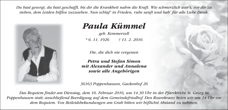 Hier finden Sie alle Traueranzeigen aus der Zeitung, die bisher für Paula Kümmel erschienen sind. Weitere Traueranzeigen, die in der Zeitung erscheinen, werden hier ebenfalls aufgelistet