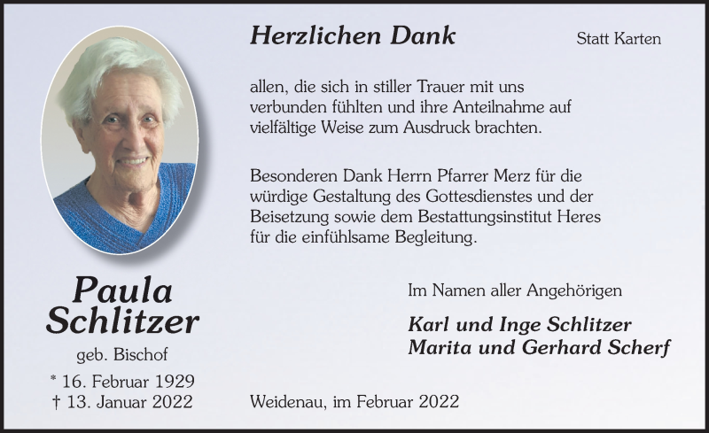 Hier finden Sie alle Traueranzeigen aus der Zeitung, die bisher für Paula Schlitzer erschienen sind. Weitere Traueranzeigen, die in der Zeitung erscheinen, werden hier ebenfalls aufgelistet
