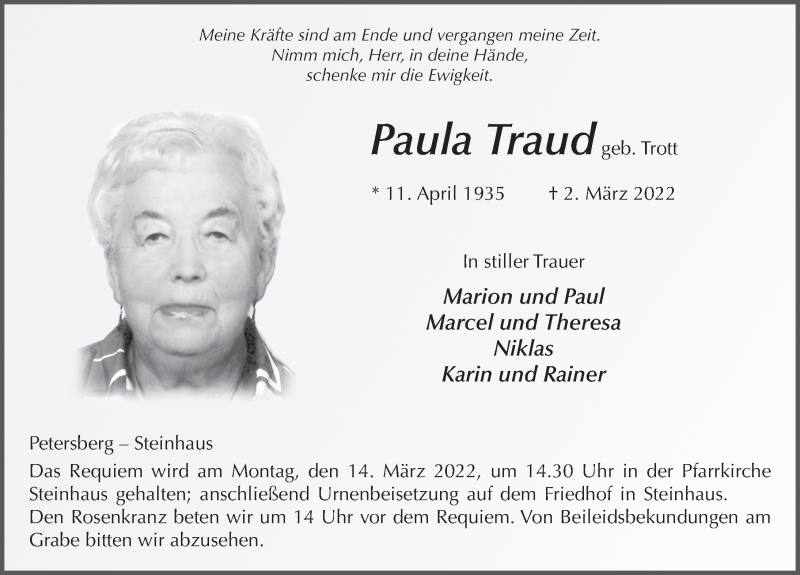 Hier finden Sie alle Traueranzeigen aus der Zeitung, die bisher für Paula Traud erschienen sind. Weitere Traueranzeigen, die in der Zeitung erscheinen, werden hier ebenfalls aufgelistet