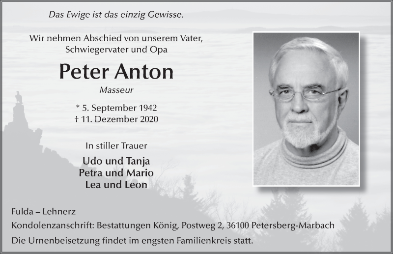 Hier finden Sie alle Traueranzeigen aus der Zeitung, die bisher für Peter Anton erschienen sind. Weitere Traueranzeigen, die in der Zeitung erscheinen, werden hier ebenfalls aufgelistet