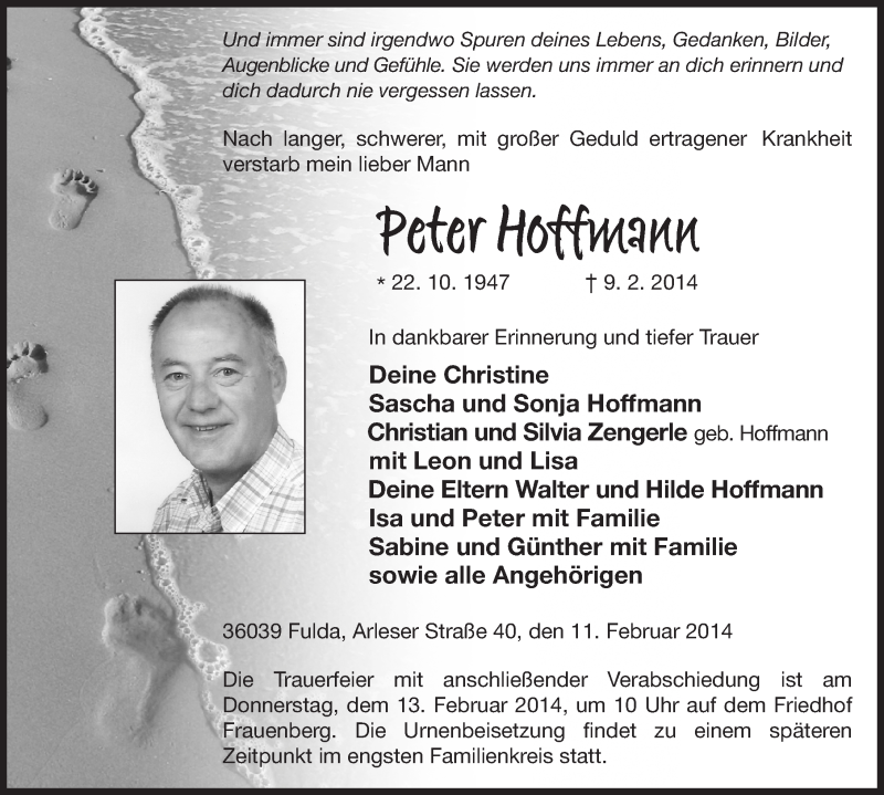 Hier finden Sie alle Traueranzeigen aus der Zeitung, die bisher für Peter Hoffmann erschienen sind. Weitere Traueranzeigen, die in der Zeitung erscheinen, werden hier ebenfalls aufgelistet