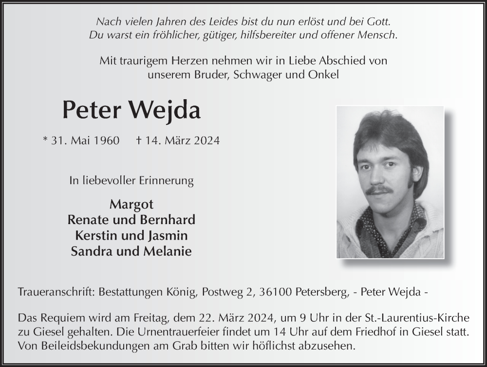 Hier finden Sie alle Traueranzeigen aus der Zeitung, die bisher für Peter Wejda erschienen sind. Weitere Traueranzeigen, die in der Zeitung erscheinen, werden hier ebenfalls aufgelistet