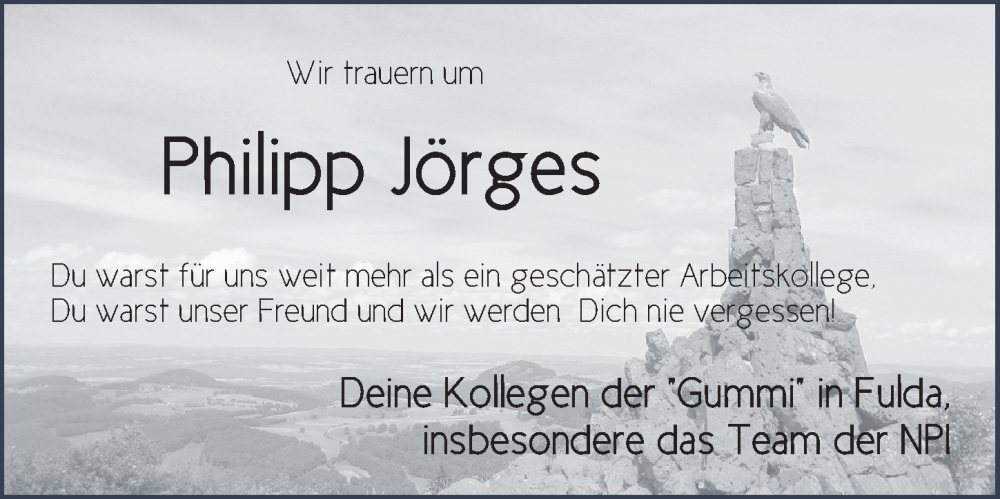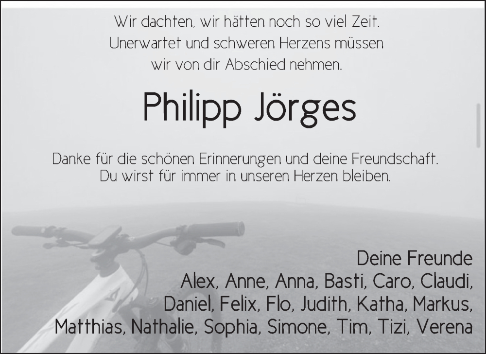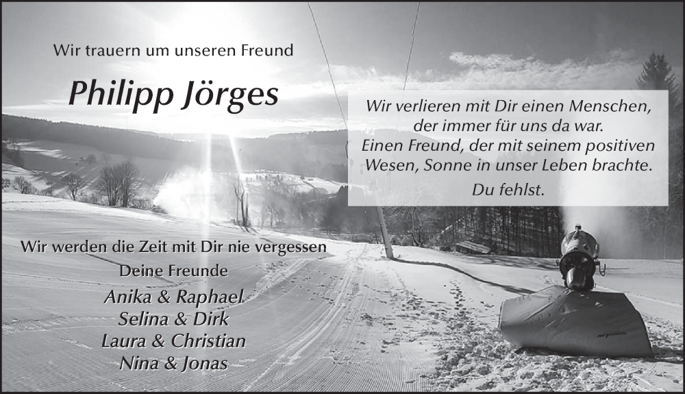 Hier finden Sie alle Traueranzeigen aus der Zeitung, die bisher für Philipp Jörges erschienen sind. Weitere Traueranzeigen, die in der Zeitung erscheinen, werden hier ebenfalls aufgelistet