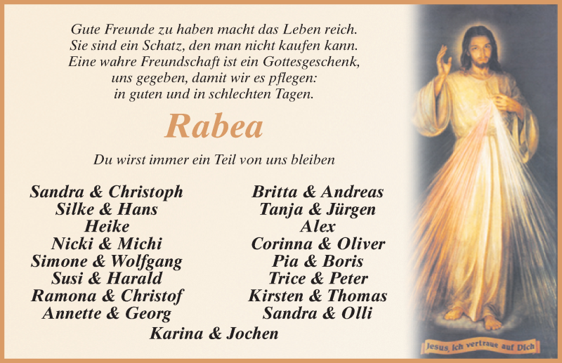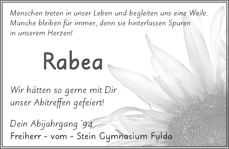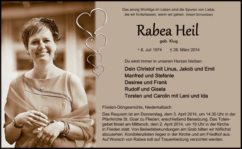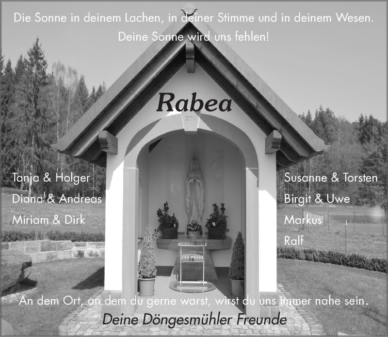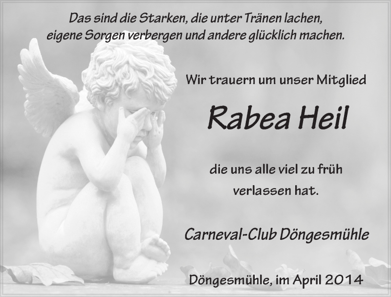 Hier finden Sie alle Traueranzeigen aus der Zeitung, die bisher für Rabea Heil erschienen sind. Weitere Traueranzeigen, die in der Zeitung erscheinen, werden hier ebenfalls aufgelistet