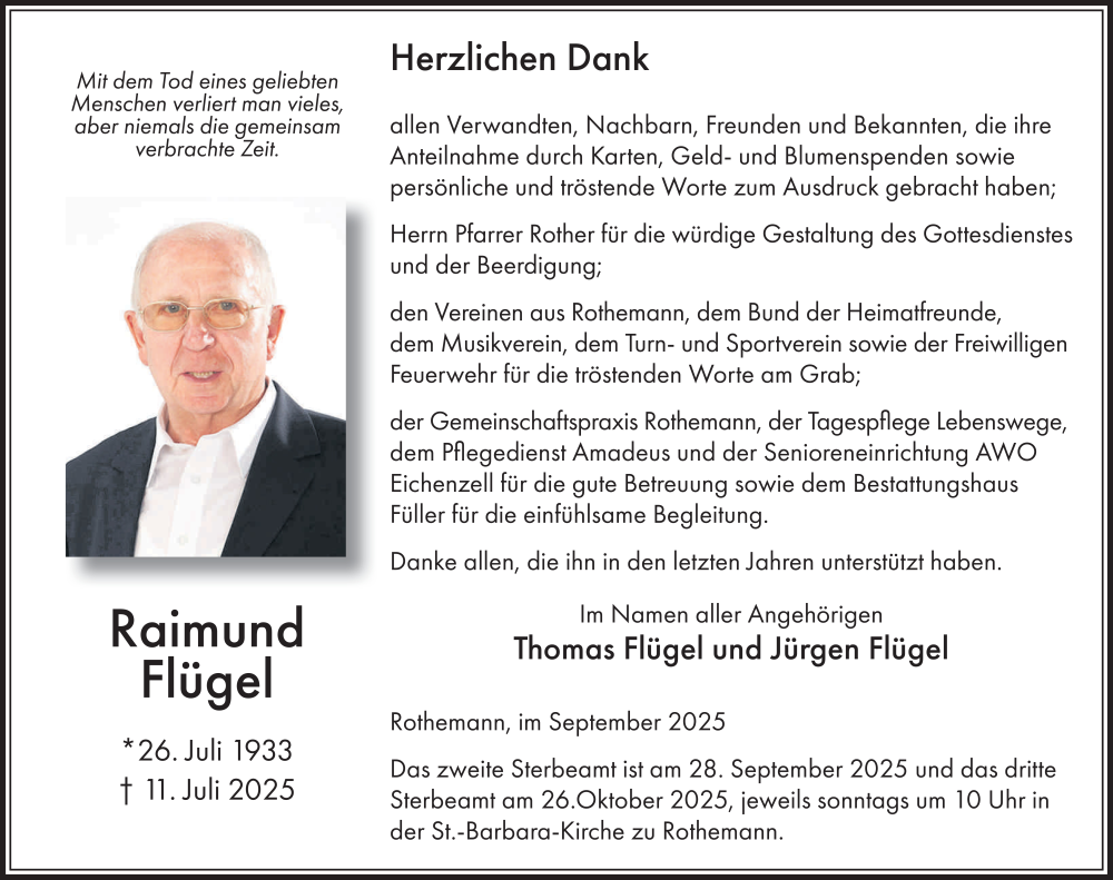 Hier finden Sie alle Traueranzeigen aus der Zeitung, die bisher für Raimund Flügel erschienen sind. Weitere Traueranzeigen, die in der Zeitung erscheinen, werden hier ebenfalls aufgelistet