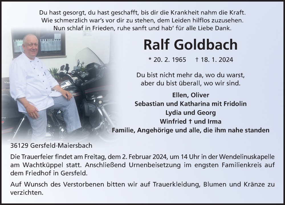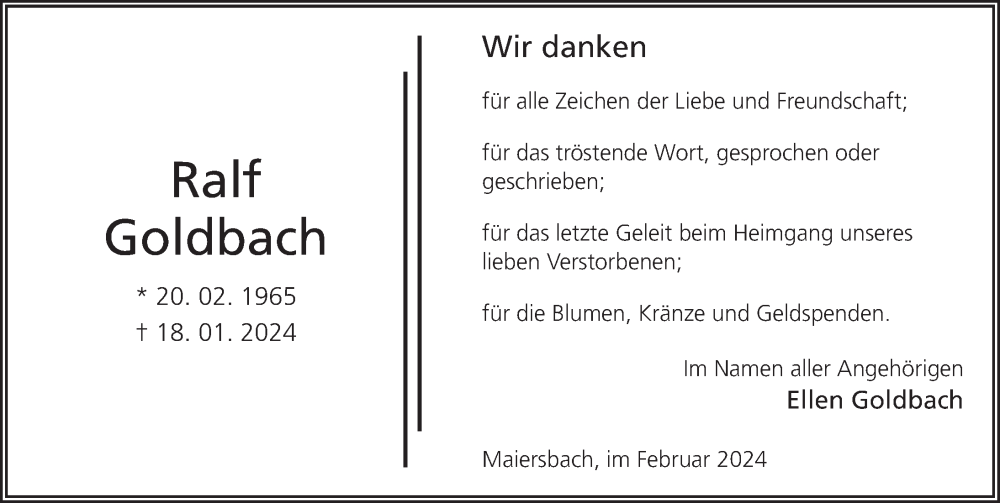 Hier finden Sie alle Traueranzeigen aus der Zeitung, die bisher für Ralf Goldbach erschienen sind. Weitere Traueranzeigen, die in der Zeitung erscheinen, werden hier ebenfalls aufgelistet