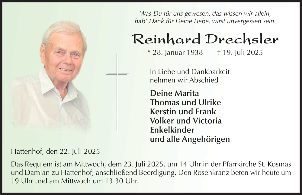 Hier finden Sie alle Traueranzeigen aus der Zeitung, die bisher für Reinhard Drechsler erschienen sind. Weitere Traueranzeigen, die in der Zeitung erscheinen, werden hier ebenfalls aufgelistet