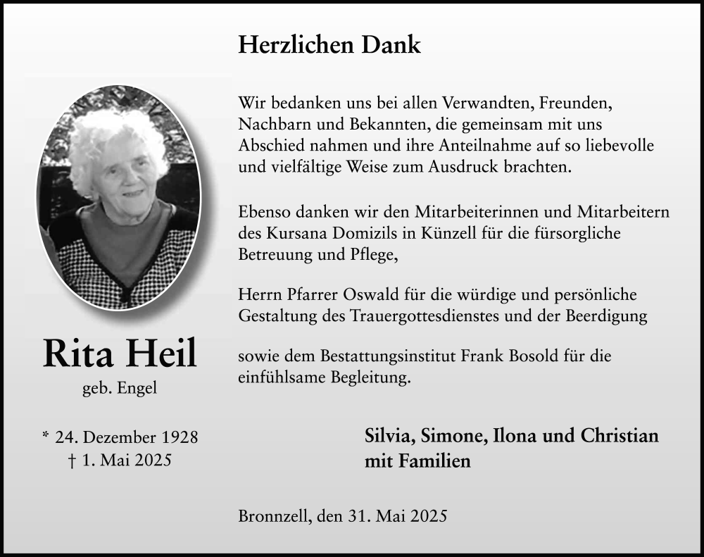Hier finden Sie alle Traueranzeigen aus der Zeitung, die bisher für Rita Heil erschienen sind. Weitere Traueranzeigen, die in der Zeitung erscheinen, werden hier ebenfalls aufgelistet