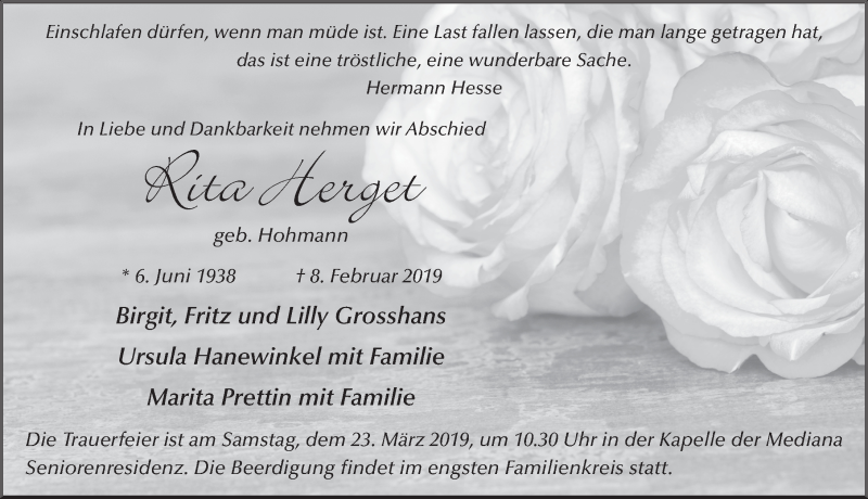 Hier finden Sie alle Traueranzeigen aus der Zeitung, die bisher für Rita Herget erschienen sind. Weitere Traueranzeigen, die in der Zeitung erscheinen, werden hier ebenfalls aufgelistet