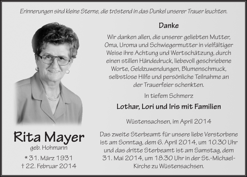 Hier finden Sie alle Traueranzeigen aus der Zeitung, die bisher für Rita Mayer erschienen sind. Weitere Traueranzeigen, die in der Zeitung erscheinen, werden hier ebenfalls aufgelistet