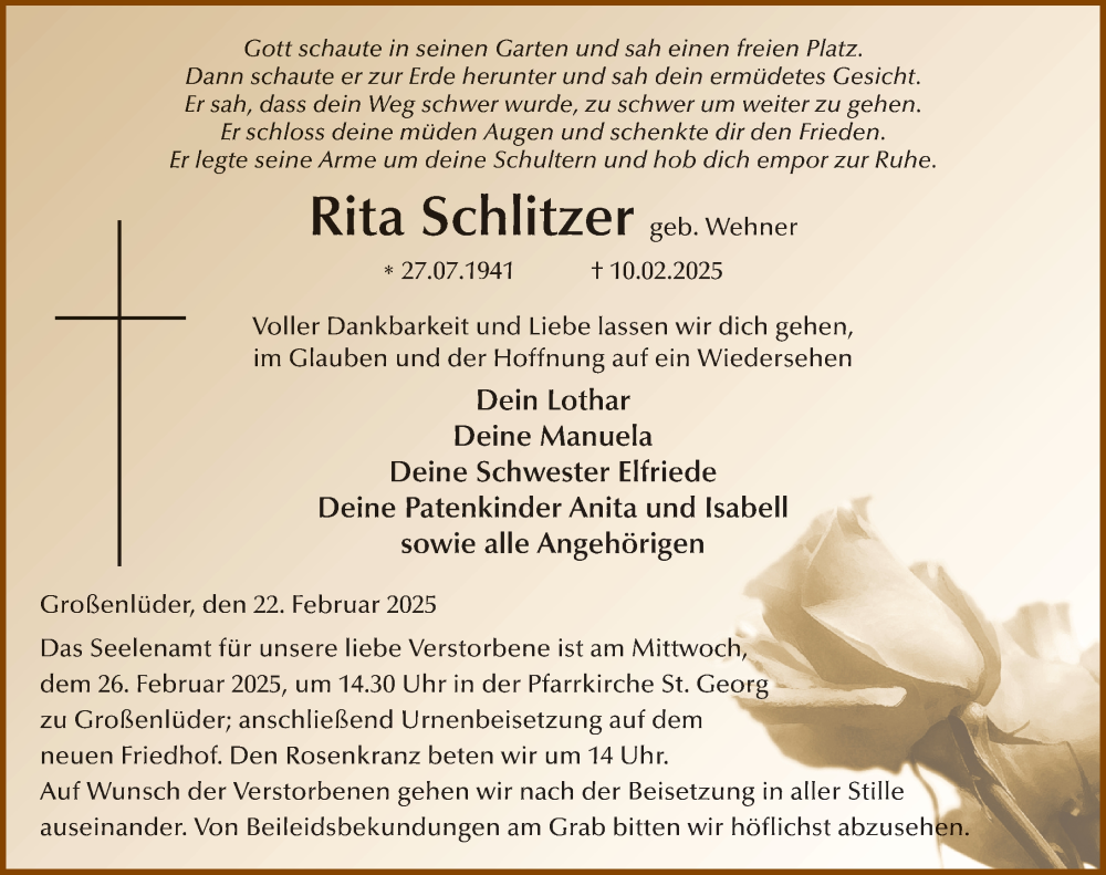 Hier finden Sie alle Traueranzeigen aus der Zeitung, die bisher für Rita Schlitzer erschienen sind. Weitere Traueranzeigen, die in der Zeitung erscheinen, werden hier ebenfalls aufgelistet