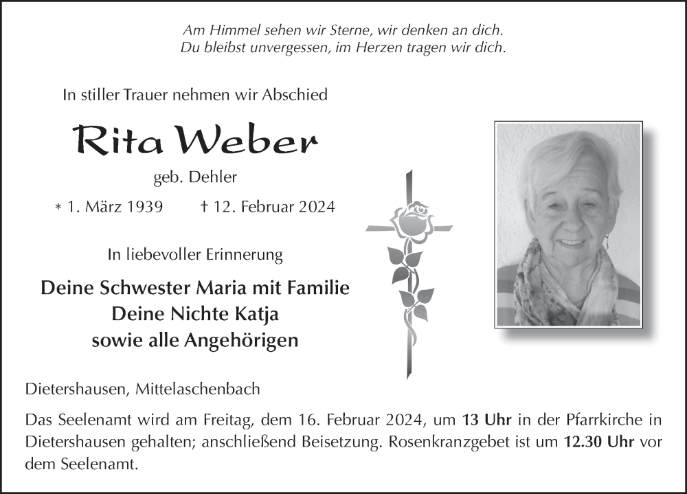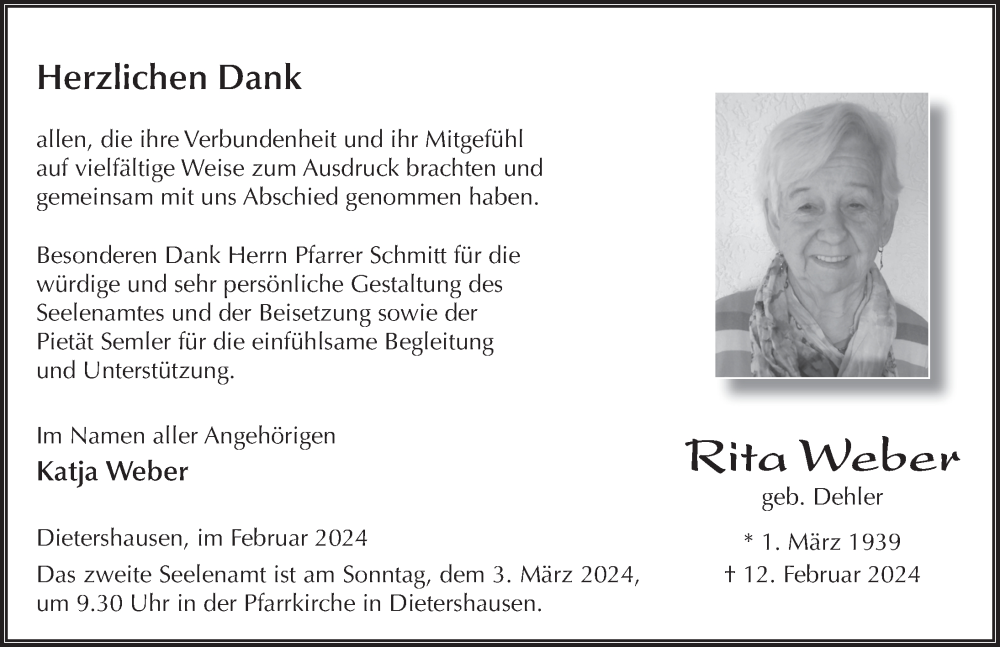 Hier finden Sie alle Traueranzeigen aus der Zeitung, die bisher für Rita Weber erschienen sind. Weitere Traueranzeigen, die in der Zeitung erscheinen, werden hier ebenfalls aufgelistet
