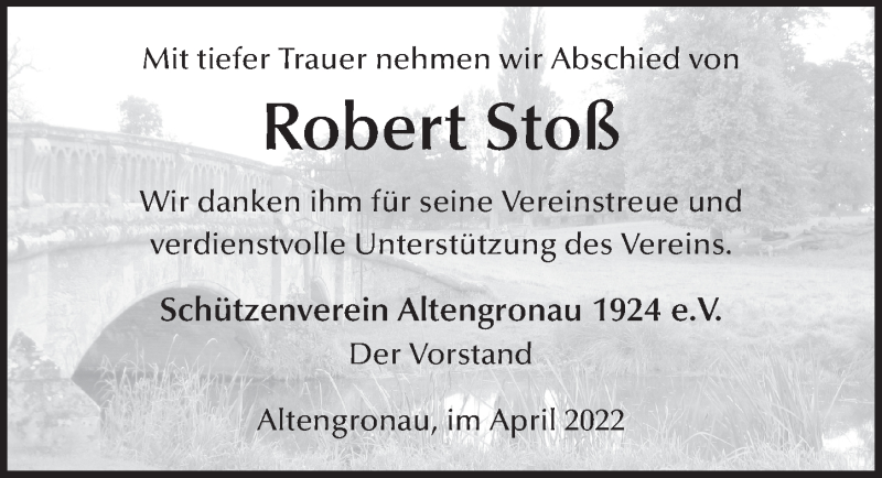 Hier finden Sie alle Traueranzeigen aus der Zeitung, die bisher für Robert Stoß erschienen sind. Weitere Traueranzeigen, die in der Zeitung erscheinen, werden hier ebenfalls aufgelistet