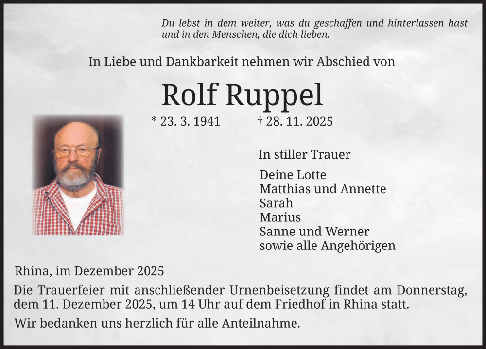 Hier finden Sie alle Traueranzeigen aus der Zeitung, die bisher für Rolf Ruppel erschienen sind. Weitere Traueranzeigen, die in der Zeitung erscheinen, werden hier ebenfalls aufgelistet