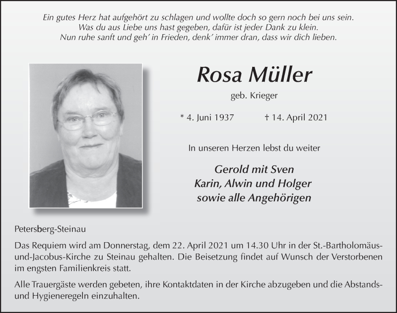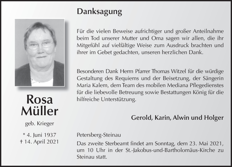 Hier finden Sie alle Traueranzeigen aus der Zeitung, die bisher für Rosa Müller erschienen sind. Weitere Traueranzeigen, die in der Zeitung erscheinen, werden hier ebenfalls aufgelistet